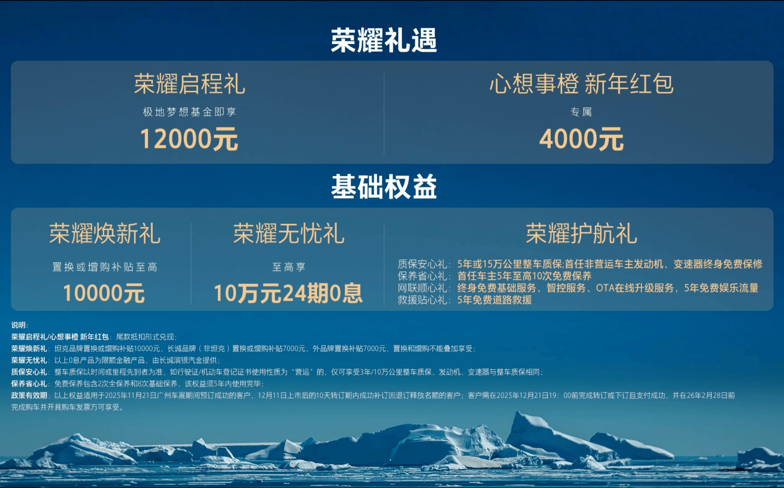 2025年12月11日,坦克300极地版正式上市,包含两款车型,售价区间22.68-24.48万元,同享梦想基金叠加新年红包礼 。该车此前已在2025广州车展首发亮相并开启预订,全球限量300辆。坦克300极地版由坦克品牌与用户共同打造,主要面向极端环境工作者以及深度越野爱好者,采用“极地橙”配色。动力上提供2.0T汽油及2.4T柴油发动机可选。