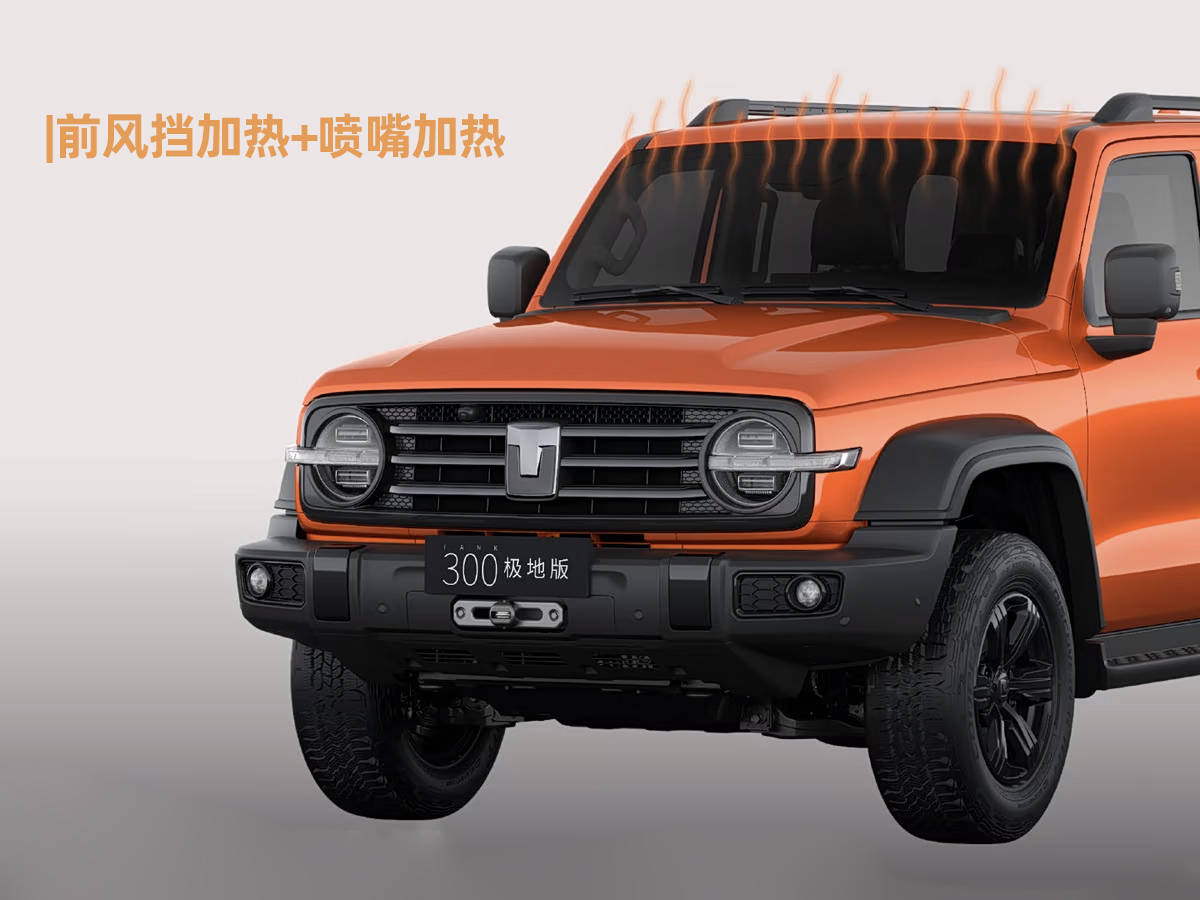 此外,坦克300极地版还提供了三套功能选装包,以满足不同用户在极寒环境下的需求。其中,“冬日守护包”包含前风挡加热和喷嘴加热,能在-30℃以下的极寒天气中有效防止风挡玻璃结冰和起雾,保障视野清晰。“雪地征服包”配备了全地形AT轮胎,大大提升了车辆在雪地、冰面等湿滑路面的抓地力。“脱困护航包”配备了无线遥控绞盘(9500磅)和2.5吨牵引资质。在极端路况下,无论是自救还是救援队友,都能轻松应对。