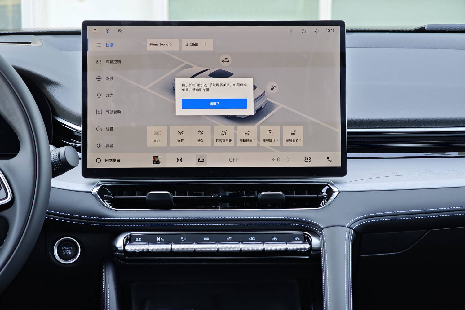 星瑞·东方曜标配14.6英寸中控屏+12.3英寸液晶仪表的组合,搭载了最新的FlymeAuto系统;此外试驾的顶配版本还配备了车载香氛、10扬声器Infinity音响、以及变道辅助、盲区监测等功能。