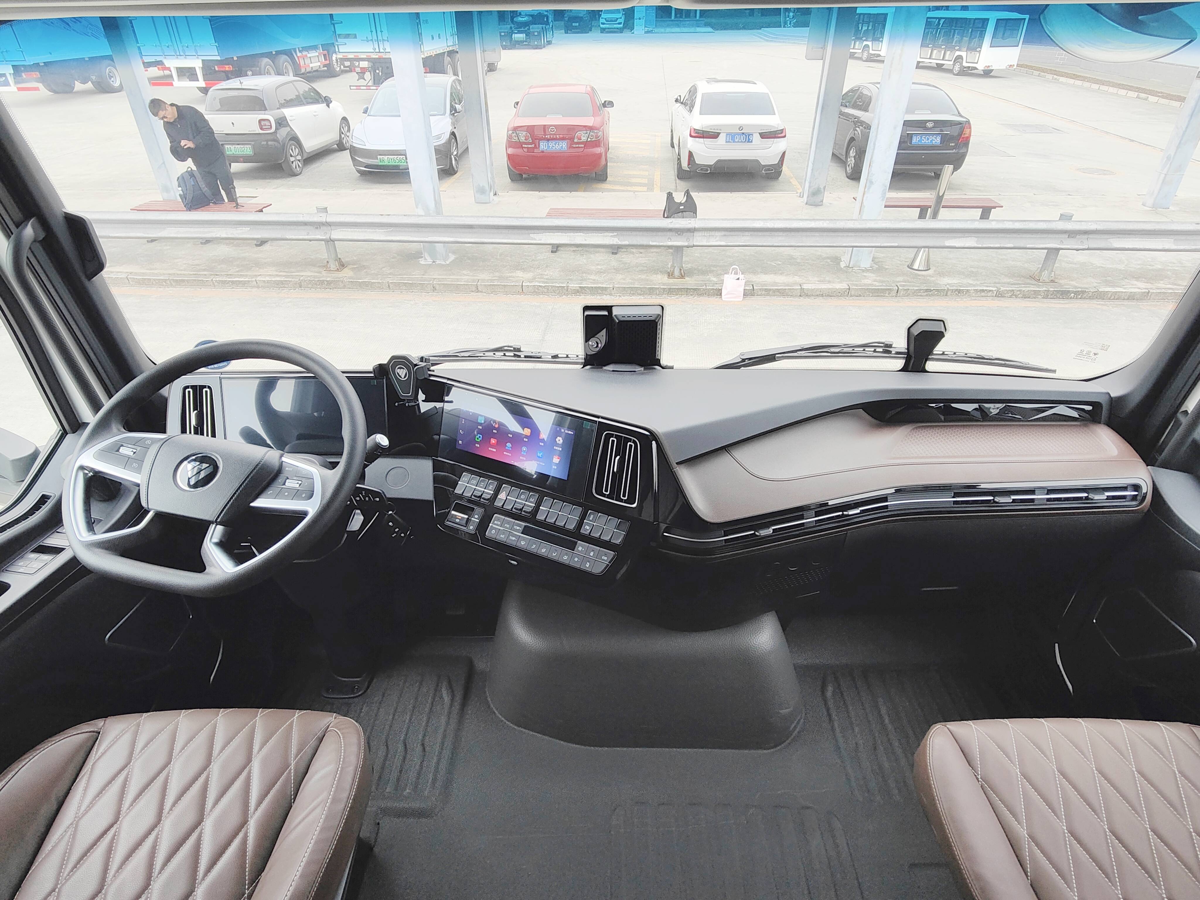 进入驾驶室,欧曼银河5M新能源牵引车的空间很舒适,新车采用平地板设计,内高1880mm、内宽2067mm,通过尺寸达到645mm,车内行动很自如。另外,车辆还采用了符合人体工程学半环绕式驾舱设计,配备了12.3寸仪表+10寸MP5+标准电动电加热,给卡友营造出了一个宽敞舒适的移动之家。