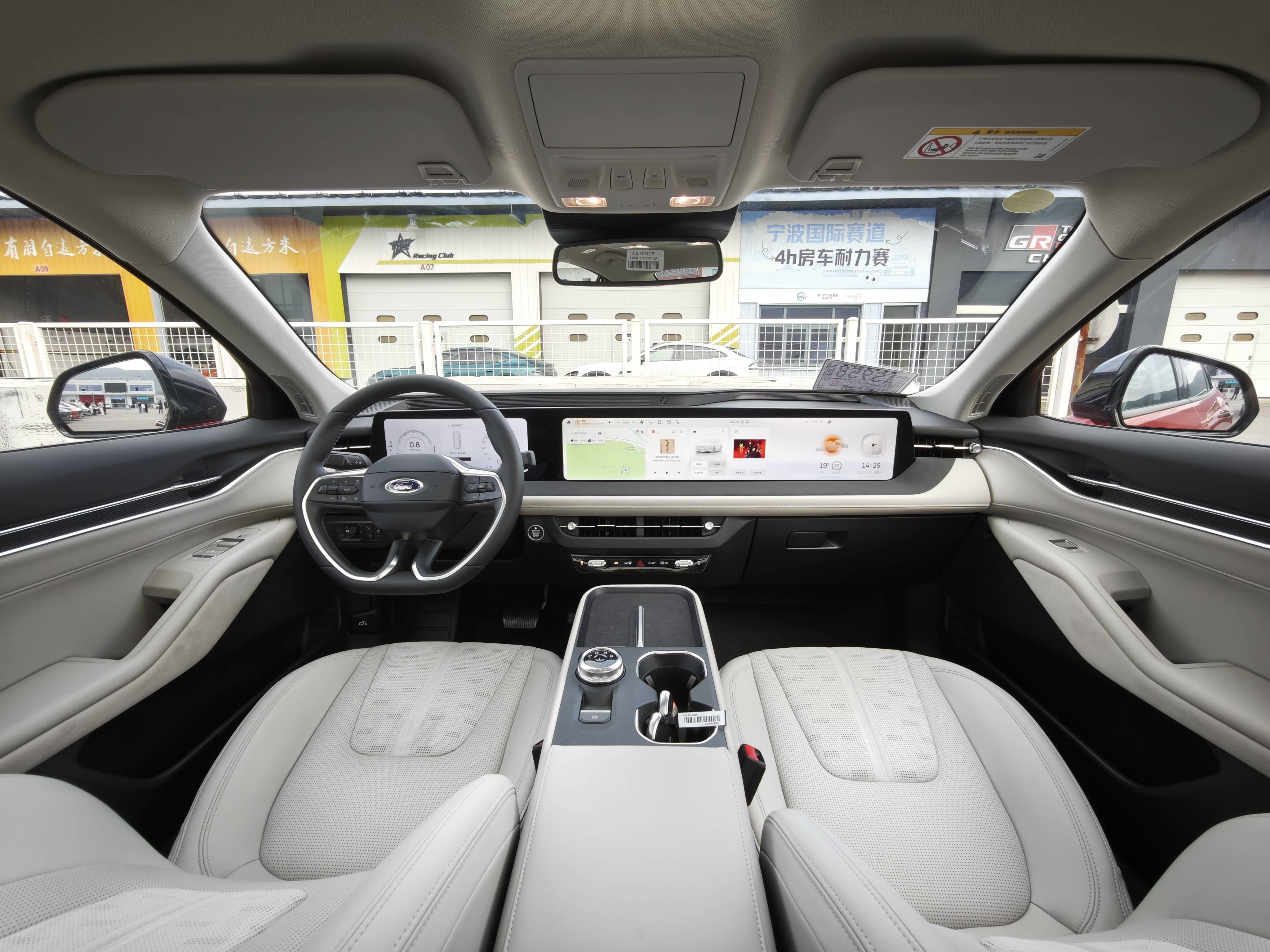 坐进新蒙迪欧车内,率先映入眼帘的依旧是这块总长度超过1.1米的贯穿式大屏,由一块12.3寸仪表屏和一块27寸的4K液晶屏共同组成。