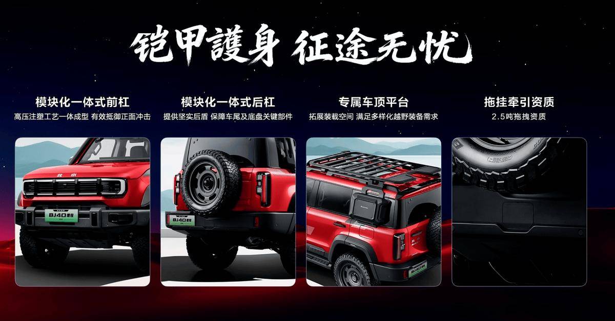 作为官方改装的越野版本,BJ40 增程赤兔版在装备层面进行全面强化。外观采用火焰红专属车漆搭配赤兔主题拉花,配备扩充版轮眉及铝合金脚踏。越野配置方面,新车搭载高进气涉水喉、氮气减振器、全地形轮胎、侧挂包、一体式前后保险杠、车顶平台及内嵌式防滚架,并具备原厂拖挂资质。