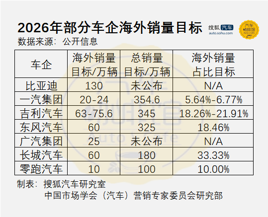 2026年部分车企海外销量目标 图源:搜狐汽车